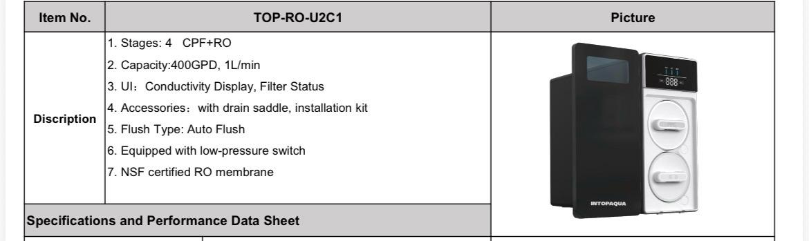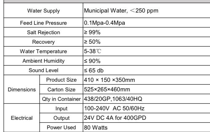 2. Capacity:400GPD, 1L/min
